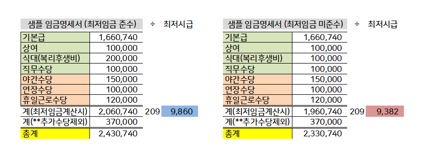 아래 예시를 살펴보면, 위의 표가 더 잘 이해가 된다. 두 임금 모두 총계를 보면 최저임금은 넘겼지만 결과가 다르다.