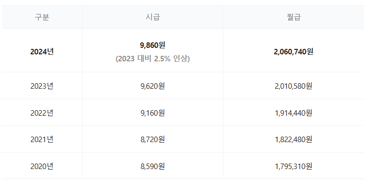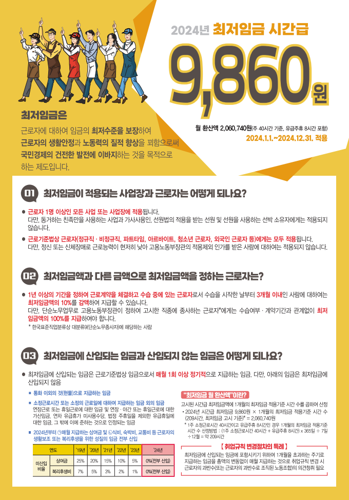 ▶ 2024년 최저시급은 2023년 대비 2.5% 인상된 9,860원이다. 물가는 진짜 쑥쑥 오르는데 월급은 왜 제자리걸음인 것만 같지.......