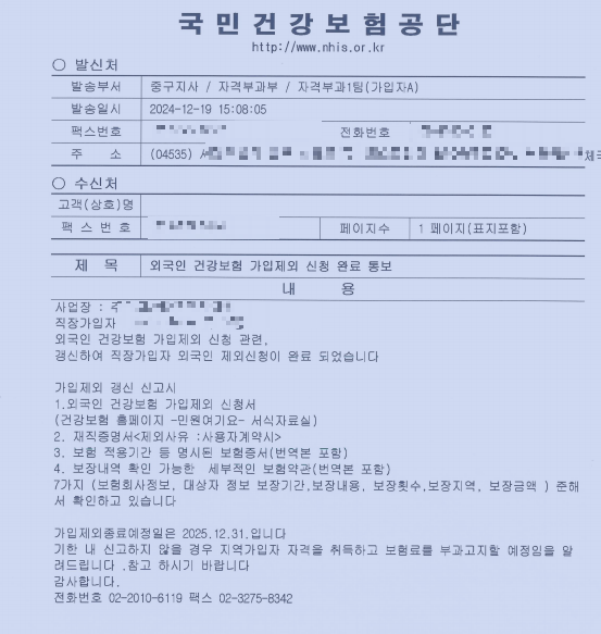 그렇게 신고를 하고 나면 하루 안으로 FAX로 외국인 건강보험 가입제외 신청 완료 통보서가 올 것이다. 너희 회사의 신고가 잘 이루어졌고, 가입제외 종료일은 언제고 이런 내용들이다. 그 FAX가 오고 나면 아 내가 잘못한 것 없이 잘 서류를 구비했구나라고 생각하면 된다. 만약 잘못한 게 있으면 공단에서 연락이 오거나 반려 처리가 될 것이다.
